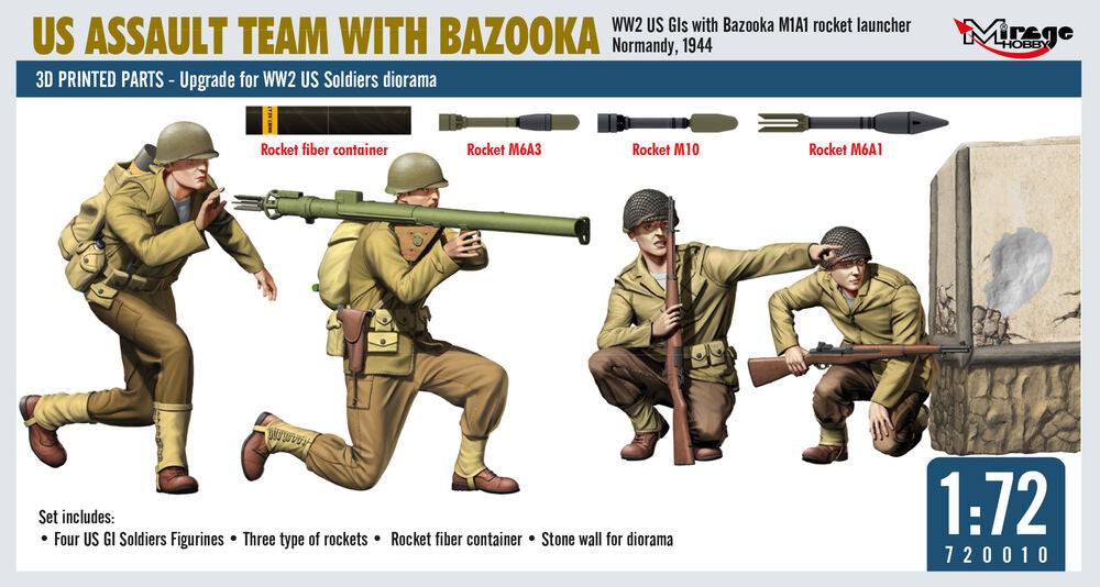 US ASSAULT TEAM WITH BAZOOKA, WW2 US GIs with Bazooka M1A1 rocket launcher Normandy, 1944